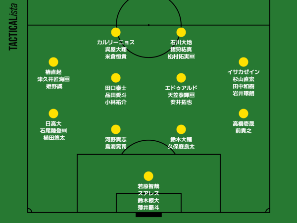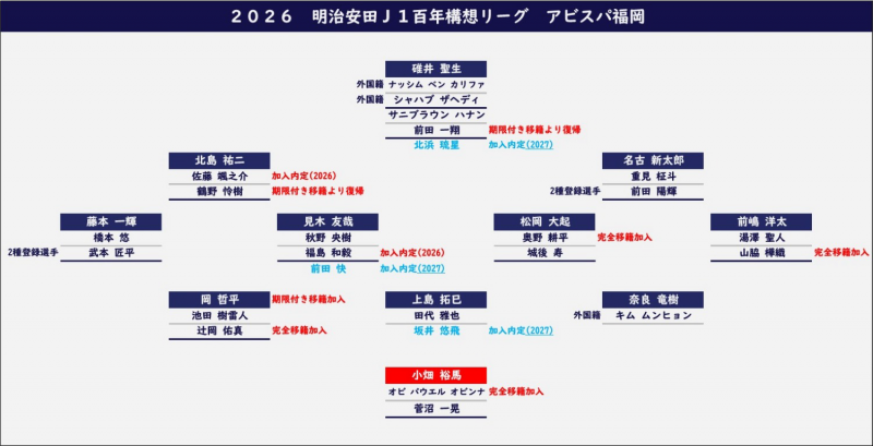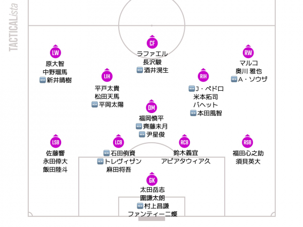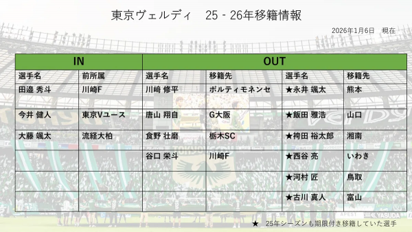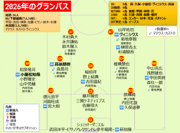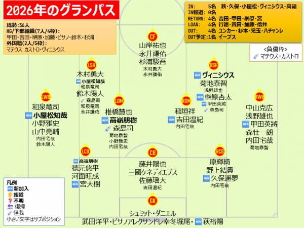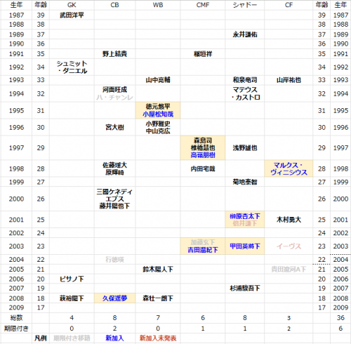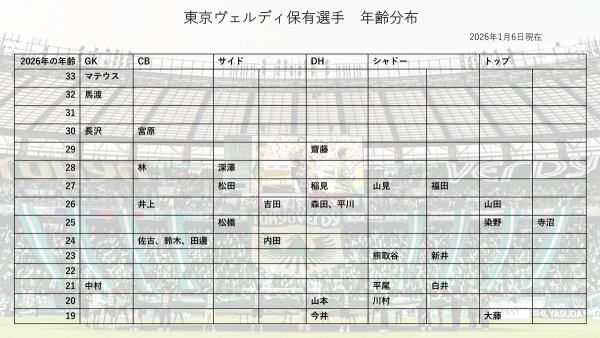 Jリーグ開幕前編成チェック J1(2026) J1 / J2 / J3 / JFL / 総合 鹿島アントラーズ タケゴラ 最終更新:2026/01/05 20:25 選手IN / OUT動向 📖スタッフ・選手一覧 水戸ホーリーホック 最終更新: 選手IN / OUT動向 📖スタッフ・選手一覧 浦和レッドダイヤモンズ ゆうき 最終更新:2026/01/12 18:17 選手IN / OUT動向 📖スタッフ・選手一覧 ジェフユナイテッド千葉 arata 最終更新:2026/01/19 06:00 選手IN / OUT動向 📖スタッフ・選手一覧 柏レイソル tassiy 最終更新:2026/01/04 18:28 選手IN / OUT動向 📖スタッフ・選手一覧 FC東京 ひかる 最終更新:2026/01/18 12:41 選手IN / OUT動向 📖スタッフ・選手一覧 東京ヴェルディ1969 tad 最終更新:2026/02/01 21:01 選手IN / OUT動向 📖スタッフ・選手一覧 FC町田ゼルビア りんぐ 最終更新:2026/01/07 20:32 選手IN / OUT動向 📖スタッフ・選手一覧 川崎フロンターレ せこ 最終更新:2026/01/05 23:50 選手IN / OUT動向 📖スタッフ・選手一覧 横浜F・マリノス asukasu 最終更新:2026/01/17 19:13 選手IN / OUT動向 📖スタッフ・選手一覧 清水エスパルス mokichi 最終更新:2026/01/11 15:59 選手IN / OUT動向 📖スタッフ・選手一覧 名古屋グランパスエイト グラぽ 1-3-4-2-1 1-3-5-2 最終更新:2026/01/25 10:01 選手IN / OUT動向 📖スタッフ・選手一覧 京都サンガF.C. データで見る京都サンガF.C. 最終更新:2026/01/18 19:54 選手IN / OUT動向 📖スタッフ・選手一覧 ガンバ大阪 ちくわ 最終更新:2026/01/06 00:33 選手IN / OUT動向 📖スタッフ・選手一覧 セレッソ大阪 Maasyu 最終更新:2026/01/30 12:26 選手IN / OUT動向 📖スタッフ・選手一覧 ヴィッセル神戸 フットボールベアー 1-4-3-3 1-3-6-1 最終更新:2026/01/09 22:36 選手IN / OUT動向 📖スタッフ・選手一覧 ファジアーノ岡山FC ファジスキー 最終更新:2026/01/05 18:58 選手IN / OUT動向 📖スタッフ・選手一覧 サンフレッチェ広島F.C かんだ 最終更新:2026/01/05 23:47 選手IN / OUT動向 📖スタッフ・選手一覧 アビスパ福岡 ma_c 最終更新:2026/01/12 00:43 選手IN / OUT動向 📖スタッフ・選手一覧 V・ファーレン長崎 庶民のどせいさん'26 最終更新:2026/01/18 11:01 選手IN / OUT動向 📖スタッフ・選手一覧 [ 前年 | 編成チェックに戻る | 翌年 ]