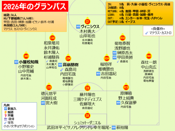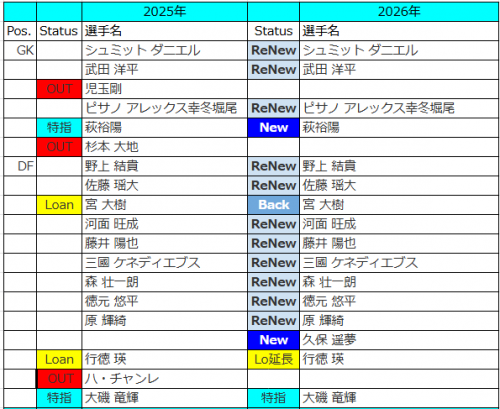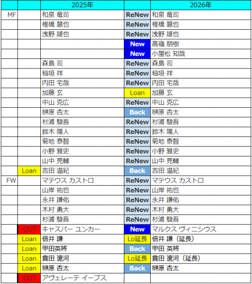 Jリーグ開幕前編成チェック J1(2026) J1 / J2 / J3 / JFL / 総合 鹿島アントラーズ タケゴラ 最終更新:2026/01/05 20:25 選手IN / OUT動向 📖スタッフ・選手一覧 水戸ホーリーホック 最終更新: 選手IN / OUT動向 📖スタッフ・選手一覧 浦和レッドダイヤモンズ ゆうき 最終更新:2026/01/12 18:17 選手IN / OUT動向 📖スタッフ・選手一覧 ジェフユナイテッド千葉 arata 最終更新:2025/12/31 選手IN / OUT動向 📖スタッフ・選手一覧 柏レイソル tassiy 最終更新:2026/01/04 18:28 選手IN / OUT動向 📖スタッフ・選手一覧 FC東京 ひかる 「鋭意作成中」 最終更新: 選手IN / OUT動向 📖スタッフ・選手一覧 東京ヴェルディ1969 tad 最終更新:2026/01/06 00:00 選手IN / OUT動向 📖スタッフ・選手一覧 FC町田ゼルビア りんぐ 最終更新:2026/01/07 20:32 選手IN / OUT動向 📖スタッフ・選手一覧 川崎フロンターレ せこ 最終更新:2026/01/05 23:50 選手IN / OUT動向 📖スタッフ・選手一覧 横浜F・マリノス 最終更新: 選手IN / OUT動向 📖スタッフ・選手一覧 清水エスパルス mokichi 最終更新:2026/01/11 15:59 選手IN / OUT動向 📖スタッフ・選手一覧 名古屋グランパスエイト グラぽ 最終更新:2026/01/11 10:01 選手IN / OUT動向 📖スタッフ・選手一覧 京都サンガF.C. データで見る京都サンガF.C. 「鋭意作成中」 最終更新: 選手IN / OUT動向 📖スタッフ・選手一覧 ガンバ大阪 ちくわ 最終更新:2026/01/06 00:33 選手IN / OUT動向 📖スタッフ・選手一覧 セレッソ大阪 Maasyu 最終更新:2026/01/05 18:50 選手IN / OUT動向 📖スタッフ・選手一覧 ヴィッセル神戸 フットボールベアー 1-4-3-3 1-3-6-1 最終更新:2026/01/09 22:36 選手IN / OUT動向 📖スタッフ・選手一覧 ファジアーノ岡山FC ファジスキー 最終更新:2026/01/05 18:58 選手IN / OUT動向 📖スタッフ・選手一覧 サンフレッチェ広島F.C かんだ 最終更新:2026/01/05 23:47 選手IN / OUT動向 📖スタッフ・選手一覧 アビスパ福岡 ma_c 最終更新:2026/01/12 00:43 選手IN / OUT動向 📖スタッフ・選手一覧 V・ファーレン長崎 庶民のどせいさん'26 最終更新:2026/01/04 21:47 選手IN / OUT動向 📖スタッフ・選手一覧 [ 前年 | 編成チェックに戻る | 翌年 ]