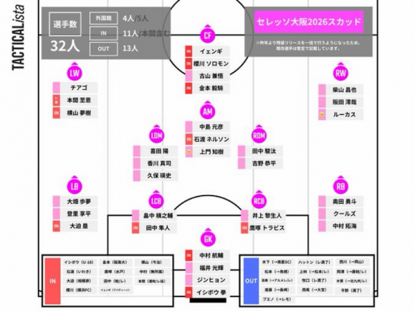 Jリーグ開幕前編成チェック J1(2026) J1 / J2 / J3 / JFL / 総合 鹿島アントラーズ タケゴラ 最終更新:2026/01/05 20:25 選手IN / OUT動向 📖スタッフ・選手一覧 水戸ホーリーホック 最終更新: 選手IN / OUT動向 📖スタッフ・選手一覧 浦和レッドダイヤモンズ ゆうき 最終更新:2026/01/12 18:17 選手IN / OUT動向 📖スタッフ・選手一覧 ジェフユナイテッド千葉 arata 最終更新:2026/01/19 06:00 選手IN / OUT動向 📖スタッフ・選手一覧 柏レイソル tassiy 最終更新:2026/01/04 18:28 選手IN / OUT動向 📖スタッフ・選手一覧 FC東京 ひかる 最終更新:2026/01/18 12:41 選手IN / OUT動向 📖スタッフ・選手一覧 東京ヴェルディ1969 tad 最終更新:2026/02/01 21:01 選手IN / OUT動向 📖スタッフ・選手一覧 FC町田ゼルビア りんぐ 最終更新:2026/01/07 20:32 選手IN / OUT動向 📖スタッフ・選手一覧 川崎フロンターレ せこ 最終更新:2026/01/05 23:50 選手IN / OUT動向 📖スタッフ・選手一覧 横浜F・マリノス asukasu 最終更新:2026/01/17 19:13 選手IN / OUT動向 📖スタッフ・選手一覧 清水エスパルス mokichi 最終更新:2026/01/11 15:59 選手IN / OUT動向 📖スタッフ・選手一覧 名古屋グランパスエイト グラぽ 1-3-4-2-1 1-3-5-2 最終更新:2026/01/25 10:01 選手IN / OUT動向 📖スタッフ・選手一覧 京都サンガF.C. データで見る京都サンガF.C. 最終更新:2026/01/18 19:54 選手IN / OUT動向 📖スタッフ・選手一覧 ガンバ大阪 ちくわ 最終更新:2026/01/06 00:33 選手IN / OUT動向 📖スタッフ・選手一覧 セレッソ大阪 Maasyu 最終更新:2026/01/30 12:26 選手IN / OUT動向 📖スタッフ・選手一覧 ヴィッセル神戸 フットボールベアー 1-4-3-3 1-3-6-1 最終更新:2026/01/09 22:36 選手IN / OUT動向 📖スタッフ・選手一覧 ファジアーノ岡山FC ファジスキー 最終更新:2026/01/05 18:58 選手IN / OUT動向 📖スタッフ・選手一覧 サンフレッチェ広島F.C かんだ 最終更新:2026/01/05 23:47 選手IN / OUT動向 📖スタッフ・選手一覧 アビスパ福岡 ma_c 最終更新:2026/01/12 00:43 選手IN / OUT動向 📖スタッフ・選手一覧 V・ファーレン長崎 庶民のどせいさん'26 最終更新:2026/01/18 11:01 選手IN / OUT動向 📖スタッフ・選手一覧 [ 前年 | 編成チェックに戻る | 翌年 ]